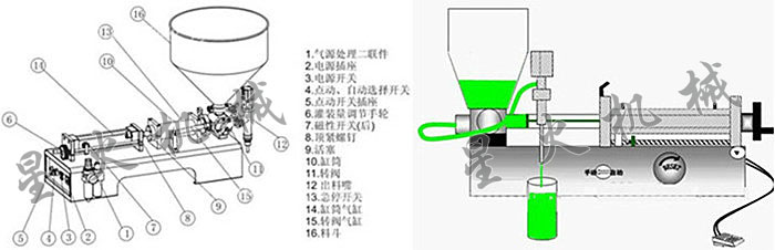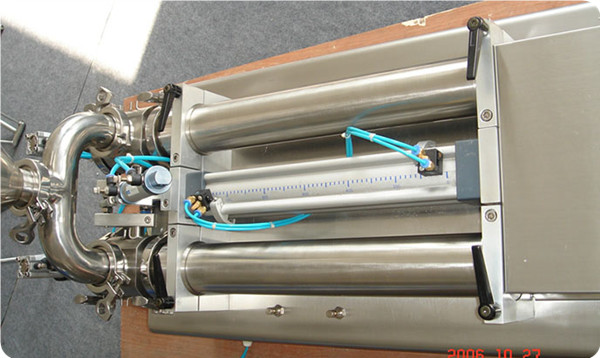 通過氣缸帶動(dòng)一個(gè)活塞來抽取和打出物料用單向閥控制物料流向,用磁簧開關(guān)控制氣缸的行程,即可調(diào)節(jié)灌裝量。